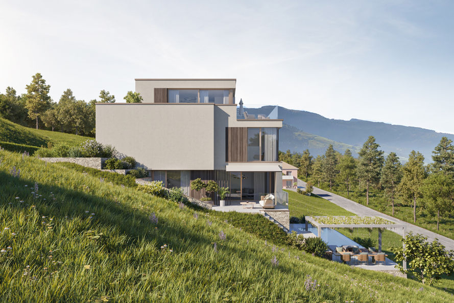 Im höher gelegenen Wohnquartier von Gams entwickelten wir im Gebiet Ebni zwei Häuser mit integrierter Doppelgarage und Attika.